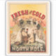 Vintage advertisement of a scene at the North Pole where polar bears are enjoying mugs of lager beer, with a trompe-l'oeil effect showing overheated people, with fans and sunshades, and one man reaching into the scene for a frosty fresh and cold mug of lager beer offered to him by a polar bear.