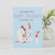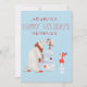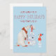 Whimsical Christmas scene features big and little polar bears decorating their tree. Watercolor illustration on light blue background with red hand drawn "Happy Holidays" message