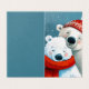 This image features two polar bears in a heartwarming embrace, set against a snowy, teal-toned background. The larger bear wears a red knit hat, decorated with subtle patterns, while the smaller bear is wrapped in a bright red scarf. Both bears have soft, rosy cheeks and serene expressions, creating a cosy and affectionate winter atmosphere. The textured, painterly style enhances the warmth and charm of the scene.
