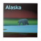 A polar bear roams the ice during the long polar night; the Northern Lights in red and green glow in the distance. Text reading "Alaska" in glowing blue and white also appears.