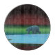 A polar bear roams the ice during the long polar night; the Northern Lights in red and green glow in the distance.