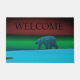 A polar bear roams the ice during the long polar night; the Northern Lights in red and green glow in the distance. Text reading, "WELCOME" also appears.