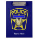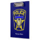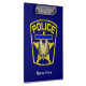 This custom dark blue clipboard is decorated with a police badge and can be customised with a name.