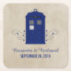 Quirky and fun Police Box Wedding Paper Coasters featuring a brilliant blue vintage police box flanked by swirl flourishes and blue stars on a faux vintage paper background. Easy to customise, simply add your wedding details in the text fields provided. Click "Customise It" to find more personalisation options.