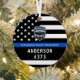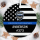 Thin Blue Line Police Department Christmas Ornament - American flag in Police Flag colours, modern black and blue design . Customise with your department logo, and personalise with police officers name and badge number. This personalised law enforcement ornament is perfect for police departments and law enforcement officers, stocking stuffers and christmas gifts to your police officers. Order these police ornaments bulk wholesale for the police academy or police department gifts, police christmas stocking stuffers. COPYRIGHT © 2020 Judy Burrows, Black Dog Art - All Rights Reserved. Police Department Custom Logo Blue Law Enforcement Metal Ornament