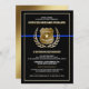 Classic gold badge, gold laurel wreath and thin blue line design for these police officer retirement invitations.