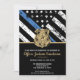 This design features a police force flag with black and white stripes, and a thin blue line stripe as well. The police badge and gold text sits above all of the party details for the retiring law enforcement officer, sheriff, captain, or chiefs retirement party details.