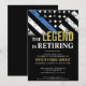 This design features a police force flag with black and white stripes, and a thin blue line stripe as well. "The Legend is Retiring" text sits above all of the party details for the retiring law enforcement officer, sheriff, captain, or chiefs retirement party details.