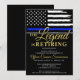 This design features a police force flag with black and white stripes, and a thin blue line stripe as well. "The Legend is Retiring" text sits above all of the party details for the retiring law enforcement officer, sheriff, captain, or chiefs retirement party details.