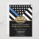 This design features a police force flag with black and white stripes, and a thin blue line stripe as well. The police hat and gold text sits above all of the party details for the retiring law enforcement officer, sheriff, captain, or chiefs retirement party details.