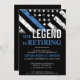 This design features a police force flag with black and white stripes, and a thin blue line stripe as well. "The Legend is Retiring" text sits above all of the party details for the retiring law enforcement officer, sheriff, captain, or chiefs retirement party details.