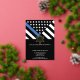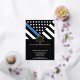 This design features a police force flag with black and white stripes, and a thin blue line stripe as well. The police badge and gold text sits above all of the party details for the retiring law enforcement officer, sheriff, captain, or chiefs retirement party details.