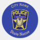 This custom round sticker is decorated with a Police Shield and can be customised above with the name of a town or city, the State name, and an Police Officer's name,or any other information you would care to substitute.