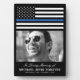 Law enforcement memorial photo plaque featuring the american stars and stripes flag with the thin blue line, a picture of the police officer, the sympathy saying "in loving memory of", their name, and dates.