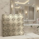 This luxurious ceramic tile features a highly detailed, repeating geometric pattern defined by clean lines of diamonds set on point, accented by minimalist crosses at the intersections. The design has a strong Art Deco or Arts and Crafts influence, presented with exceptional faux bas relief and texture. The finish is a smooth, sophisticated pewter or champagne metallic luster, offering a refined, high-gloss look. This elegant tile is perfect for creating a bright, upscale transitional statement and is ideally suited for contemporary, Art Deco, or Neoclassical applications like kitchen backsplashes, luxury bathrooms, and sophisticated accent walls. Search ID1227 to see other metallic geometric designs in this series. Note: design adapted from generative content.