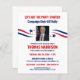 Political Campaign Kick-off Rally Fundraising invitation with patriotic red, white and blue ribbon, stars, and a placeholder for Candidate photo. All design elements and text fields can be resized for space and style. Or just add your own wording to create a finished flyer, invitation, or announcement at an affordable price.