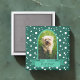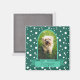 Frame a vertical photo of your pet in a classic arch frame in teal with a banner for his or her name. Background is white polka dots on teal.