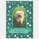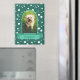 Frame a vertical photo of your pet in a classic arch frame in teal with a banner for his or her name. Background is white polka dots on teal.