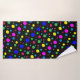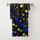 These fun bath towels are decorated with circles in a riot of colourful balloon bubble polka dots: yellow, green, turquoise, blue, red, orange and pink. Easily customise the black background on any or all of the different size towels to the colour of your choice.