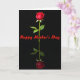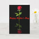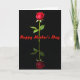 This card features a tall, single red flower with velvety petals opening slowly against a deep black background, creating a quiet, romantic mood ❤️. A slim green stem with a few small leaves rises through the centre, and below it a glossy reflection mirrors the bloom, like two lovers leaning towards each other. Focused lighting makes the reds look rich and the petal edges softly curved, while the green foliage adds a gentle contrast. In the middle of the design, a short message sits centred over the stem, written in flowing cursive-style lettering. The text uses matching red tones, standing out clearly against the dark space without crowding the flower. The overall layout feels calm and intimate, as if the bloom is being offered in a private moment 🌼. The black background stays smooth and uninterrupted, framing the flower and its mirror image in a strong vertical symmetry.