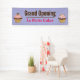Pretty cupcake bakery business banner done in cornflower blue and white tiny polka dots and graphics of two pink iced chocolate cupcakes. Brown and pink text is ready to personalise for your business needs.