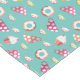 Sweet tea seamless pattern. Raspberry and orange polka dot cups, colourful cakes, doughnuts, lemon and grapefruit wedges on a light teal background.