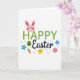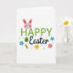 This card features a bright Easter greeting arranged in the center, with a cute round-faced bunny peeking over the first word 🐰. The bunny is soft pink with extra-long ears, rosy cheeks, and a sweet, friendly expression that feels like a warm hello to someone close. The word “HAPPY” sits prominently in lively green letters filled with small white polka dots, giving it a fresh, outdoorsy look. Just beneath it, “Easter” appears in dark, flowing cursive-style lettering that adds a gentle, romantic touch, like a note written with care. Around the text, a tiny yellow chick with wide eyes stands near a striped decorative egg, as if keeping watch beside a friend 🐇. Pastel flowers in blue with a golden center and pink with soft petals sit nearby, along with a small orange carrot and a sky-blue five-point star. Thin green grass blades and a few faint bubble-like circles float against a crisp white background.