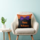 Festive Halloween design with purple and black polka dots set against an orange background on black with a bright glittery orange ribbon and glittery purple bow. Also with a haunted house, black cat, bats, crow and moon.