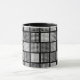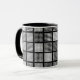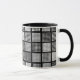 Coffee/drinks mug with stylish polka dot patchwork pattern in grey, black and white.