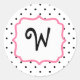 A monogram sticker featuring a background of small black polka dots over white. Personalise with your initial inside pink frame. Look for matching items at Jill's Paperie.