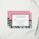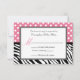 Stylish wedding reply cards with a white polka dot pattern over pink on the top and black & white zebra stripes on the bottom.
