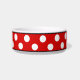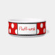 Stylish ceramic cat bowl designed with a big white polka dot pattern over red and personalised with your pet's name.