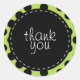 Polka dot thank you stickers. This design features a black circle with stitching effect, containing the words Thank You, against a vibrant green and black polka dot background. Copyright © Lisa Marie Robinson. All rights reserved. It is illegal to use or duplicate this, or any of our images, without written permission.