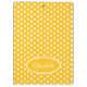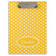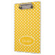 Modern bright warm yellow polka dot pattern clipboard. Customise this clipboard with your name and your family initial on both the front and back of the clipboard. Currently reads Charlotte M. Ideal personalised gift for girls and women studying at school, college or university whom want a distinctive named clipboard to use to make notes. Designed by Sarah Trett for www.mylittleeden.com