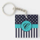 This design features a small polka dot design on top and a striped pattern on the bottom. The keychain is then accentuated with a turquoise border with a monogram logo in the centre. You can personalise this product with your own initial with the easy-to-use tool.