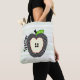 Fun teacher's tote bag, with graphics a light green and white painted striped pattern background, with whimsical graphics of a black and white polka dot apple. Black custom text reads Teacher and can be personalised to read what you want.
