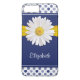 Navy blue, sunny yellow and white polka dots, daisy and ribbon personalised case. A fun, girly design to help protect your iPhone. You can personalise the name.