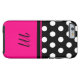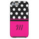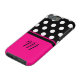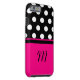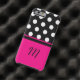 At the top of the case, a black background with white polka dots, at the bottom, a bold modern pink with a customisable monogram