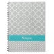 This pretty and stylish notebook has a cute light grey and aqua blue quatrefoil and polka dot pattern design. Personalise this modern spiral notebook with any name.