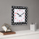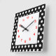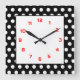 A bold black & white polka dot frame surrounds a square centre with red numbers. This design looks best on the square clocks.