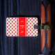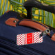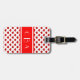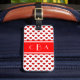 Monogram Luggage Tag with initials on red band with white border over polka heart pattern