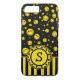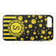 Cool tiny yellow coloured polka dot happy face pattern design on black. Retro stripe flower monogram ribbon, Personalise with your initial.