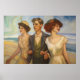 1940's abstract oil painting of three polyamorous people walking along a beach on a sunny day.