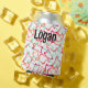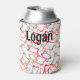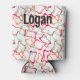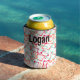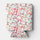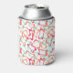 This can cooler has a mid-century modern design of polygons scattered about in shades of pink, salmon, orange, and light blue on a field of white. If you want the same design with different colours, message me.