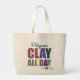 It's a polymer clay day! Carry this ample-sized to your next polymer retreat, or to an upcoming class. Stuff it with indispensable art supplies. The letters of "CLAY ALL DAY" are filled with Jubilee Cane millefiori designs by Lisa Clarke.