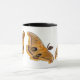 This mug features three fabulous Polyphemus Moths (Antheraea polyphemus). A huge tan coloured creature, with a wingspan of 6 inches, the most noteable feature of this amazing moth is the large, dark eyespots on its two hindwings. The eye spots are where it gets its name – from the Greek myth of the Cyclops Polyphemus.