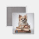 A realistic illustration of a light tan and white Pomchi (Pomeranian/Chihuahua) dog sitting atop a stack of vintage leather-bound books.
