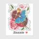 Laser cut sticker features a pomegranate and blue lunar moth with greenery and flowers.