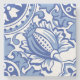 Pomegranate Bloom showcases a richly detailed fruit motif surrounded by flourishing foliage and baroque scrollwork. This design blends traditional Ottoman or Persian tile artistry with a contemporary two-tone palette of vivid and soft blues. The dynamic pomegranate form, symbolising abundance and life, becomes the centerpiece of a tile that's both decorative and meaningful.