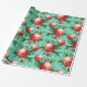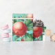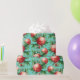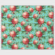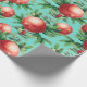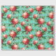 Colourful pomegranate fruits with green leaves on a light teal background.